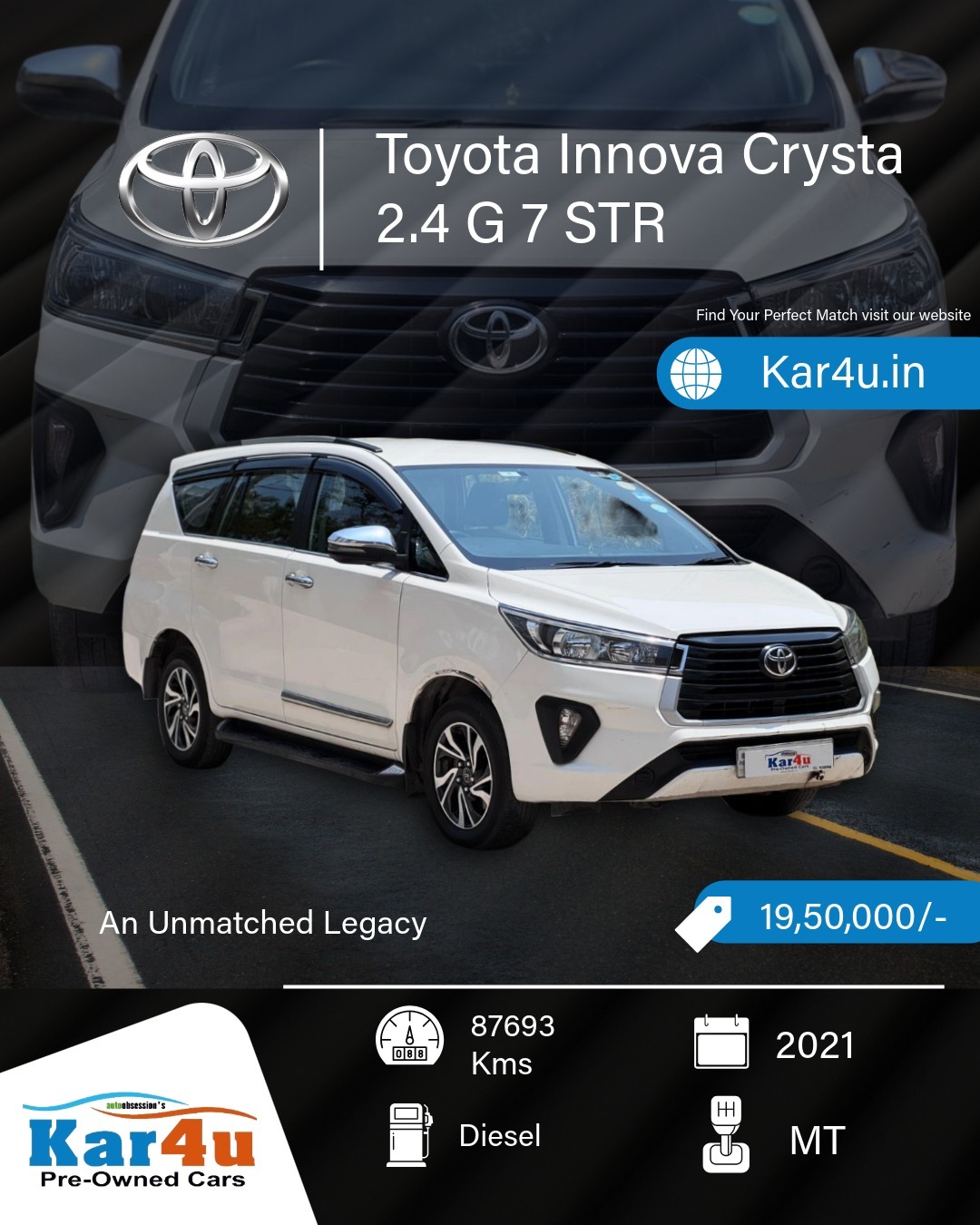 Car Make: Toyota - Car Model: Innova Crysta - Mfg Year: 2021 - Car Variant: 2.4 G 7 STR - KM Run: 87693 - Transmission: Manual - Fuel Type: Diesel - Color: White - Selling Price: 1950000/